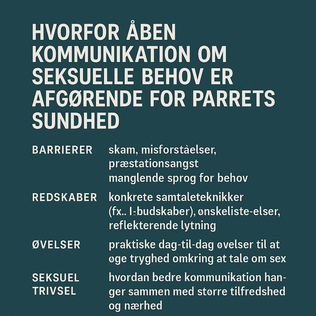 Åben kommunikation om seksuelle behov betyder, at I kan udtrykke lyst, usikkerhed, fantasier, grænser og bekymringer på en respektfuld måde, hvor begge føler sig hørt. Det handler ikke om at få sin vilje, men om at skabe et fælles sprog for intimitet, så misforståelser og skam ikke styrer jeres sexliv.