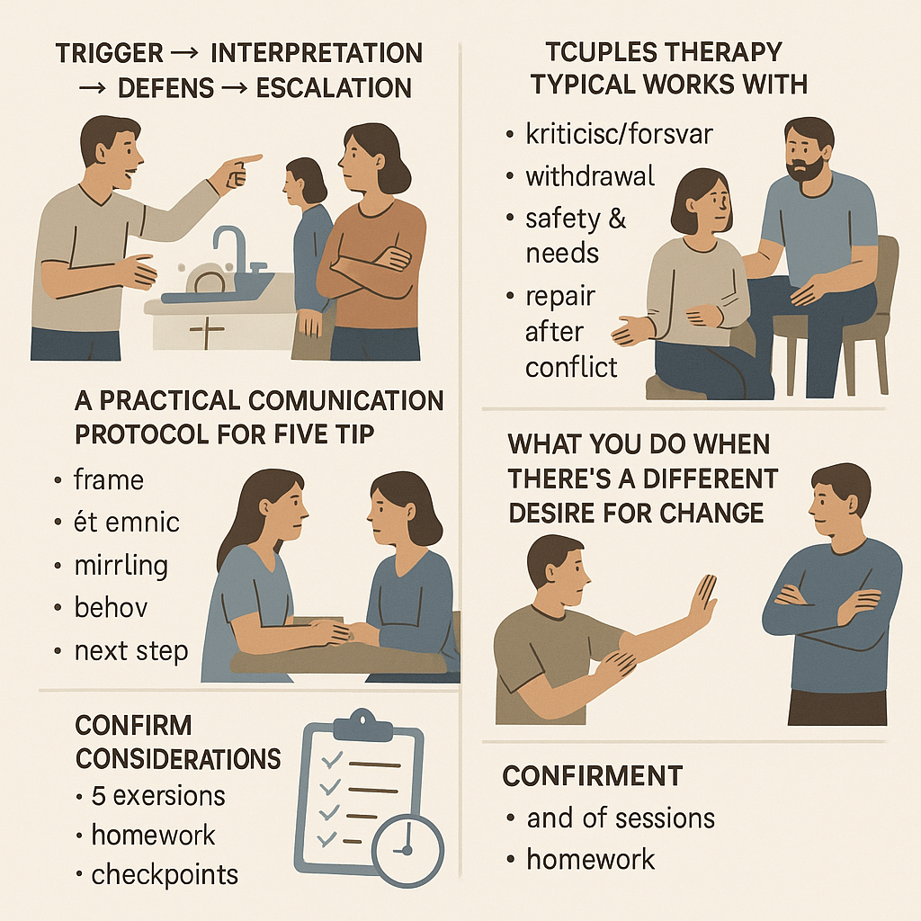 Terapi arbejder typisk med at oversætte overflade-sprog til behov: behov for ro, respekt, samarbejde, nærhed, frihed eller forudsigelighed. Når behov bliver sagt tydeligt, kan partneren reagere på det, der betyder noget, i stedet for kun at reagere på tonen.